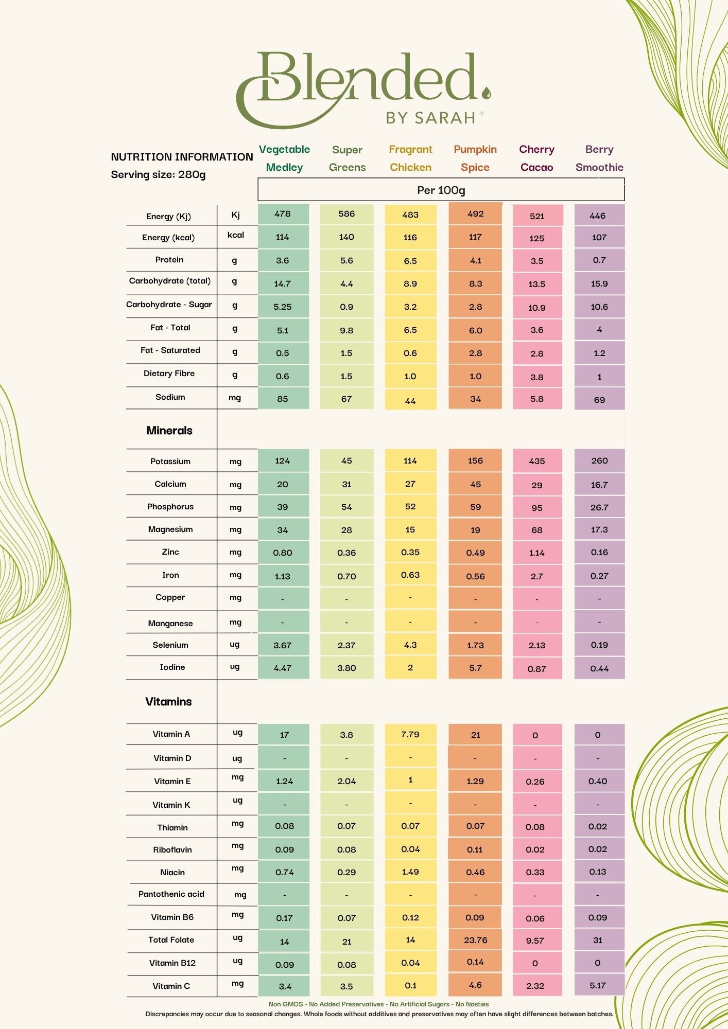 Formulations are based on whole foods without synthetic fortification or artificial additives. Nutrient values may vary slightly due to seasonal ingredient variation. For detailed nutritional analysis or batch-specific information, please contact us. Our team is available to support clinical decision-making and individualised care planning.