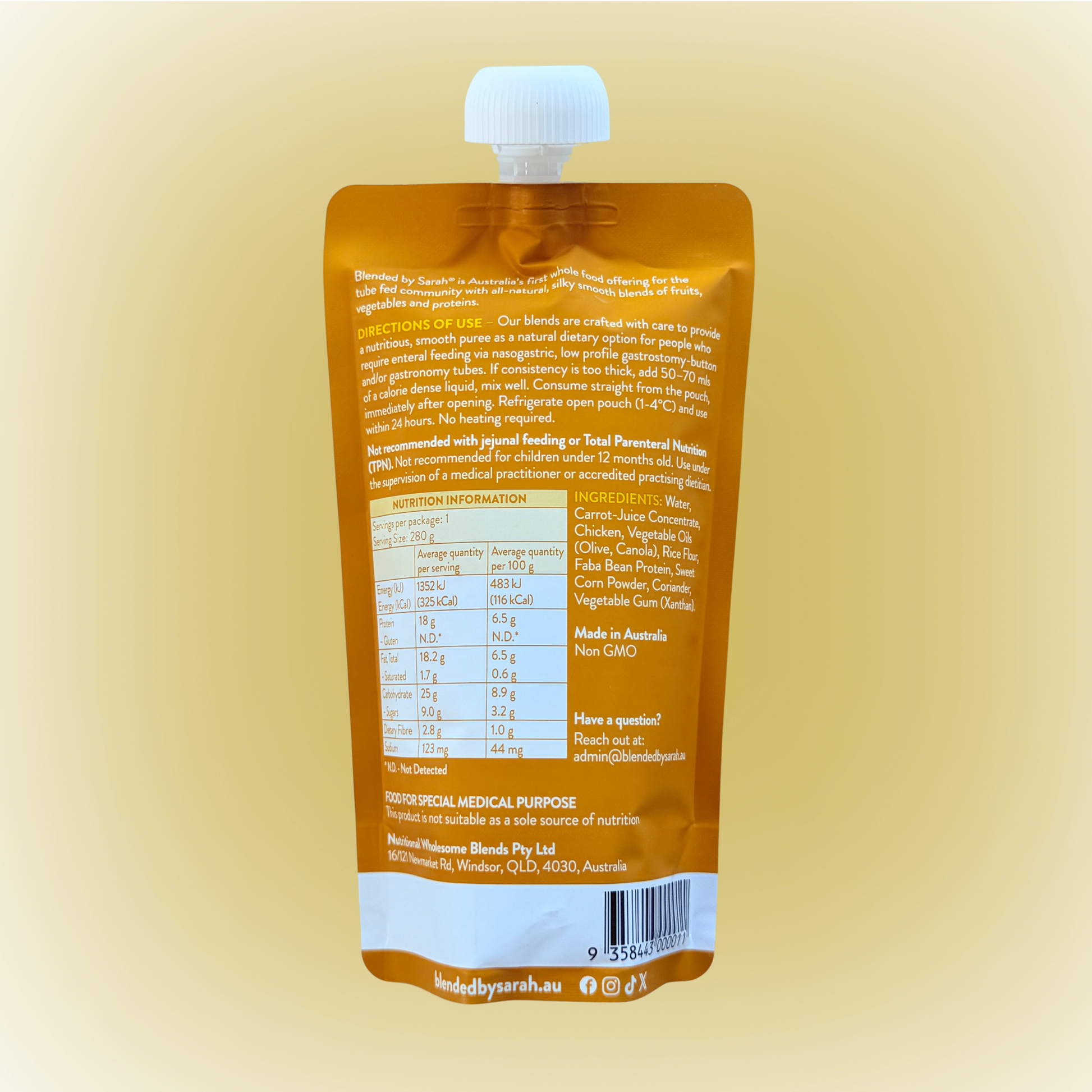 Our Chicken whole food blend features a nourishing mix of chicken, sweet potato, pumpkin, and corn. Each 280 g pouch delivers 310 kcal of whole food energy, providing a comforting and balanced meal option.